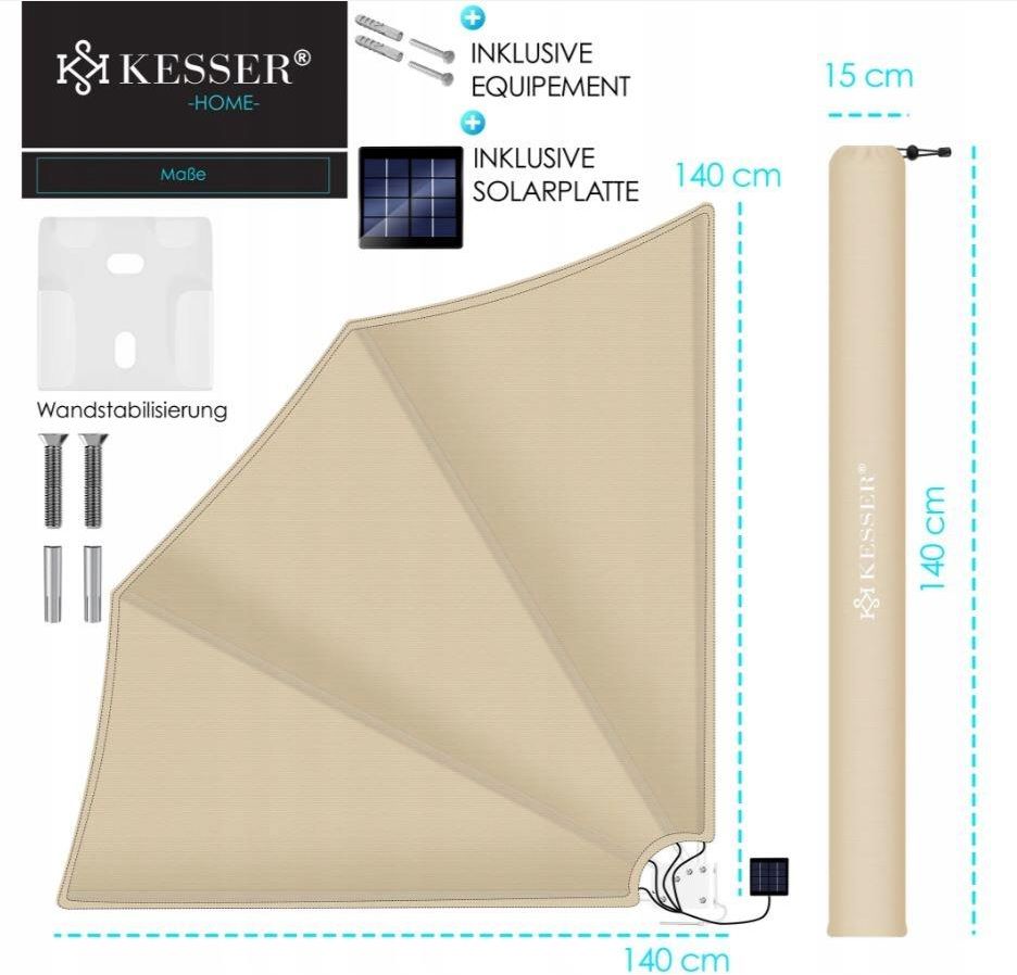 Balkonowa markiza KESSER z oświetleniem LED – idealna ochrona przed słońcem i wzrokiem sąsiadów. Szukasz skutecznego i stylowego sposobu na ochronę przed słońcem, wiatrem oraz niechcianymi spojrzeniami? Markiza balkonowa KESSER to praktyczne i eleganckie rozwiązanie, które sprawdzi się na balkonie, tarasie, w ogrodzie, przy oknie, a nawet w oranżerii. Dzięki zintegrowanym paskom LED, zasilanym przez dołączoną solarną płytkę, markiza zapewnia nie tylko cień i prywatność, ale także nastrojowe oświetlenie wieczorami. To idealne połączenie funkcjonalności i komfortu. Po zakończeniu użytkowania markizę można łatwo i szybko złożyć do góry, oszczędzając miejsce. System montażu jest prosty i nie wymaga specjalistycznych narzędzi, a całość można zainstalować samodzielnie. Najważniejsze cechy produktu: Solidna konstrukcja ze stali z 3-stopniową regulacją Zintegrowane paski LED zasilane energią słoneczną Wodoodporny, odporny na promieniowanie UV materiał Duża powierzchnia osłaniająca: 140 x 140 cm Łatwe składanie i rozkładanie Materiał 160g/m² poliester – odporny na warunki atmosferyczne Odczepiany i nadający się do prania pokrowiec Stabilność i trwałość dzięki metalowemu trzpieniowi blokującemu Ochrona przed słońcem, wiatrem i deszczem Estetyczny wygląd i funkcjonalność w jednym Szybki montaż i łatwa konserwacja Dane techniczne: Materiał: 160g/m² poliester Wymiary po rozłożeniu: 140 x 140 cm Konstrukcja: stalowa rama z regulacją Zasilanie LED: panel solarny Zawartość zestawu: 1x markiza balkonowa KESSER z oświetleniem LED 1x panel solarny 1x torba transportowa Montażowy zestaw akcesoriów Oznaczenie: 1/26-0325