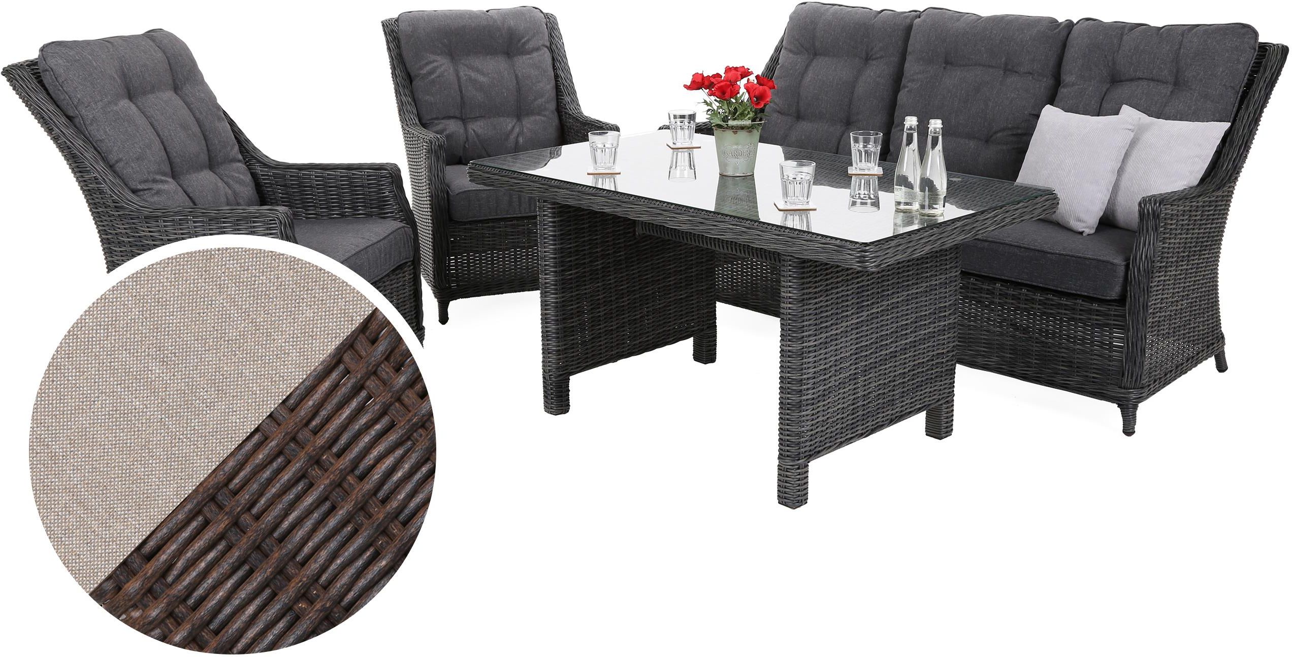 Alicante to komplet mebli ogrodowych, który prezentuje się świetnie zarówno w ogrodzie jak i w domu. Swobodnie pomieści dużą rodzinę oraz grono przyjaciół. Prostokątny, technorattanowy stół o zaokrąglonych rogach posiada blat z szybą hartowaną o grubości 5 mm. W skład zestawu wchodzi również duża sofa z dwoma fotelami oraz wygodnymi wodoodpornymi poduszkami. Ręcznie wyplatany technorattan sprawia, że meble są zdecydowanie wytrzymałe oraz prezentują się bardziej naturalnie. Poduszki zostały uszyte z wysokiej jakości poliestru i zostały zaimpregnowane, dzięki czemu są odporne na wilgoć i wodę.