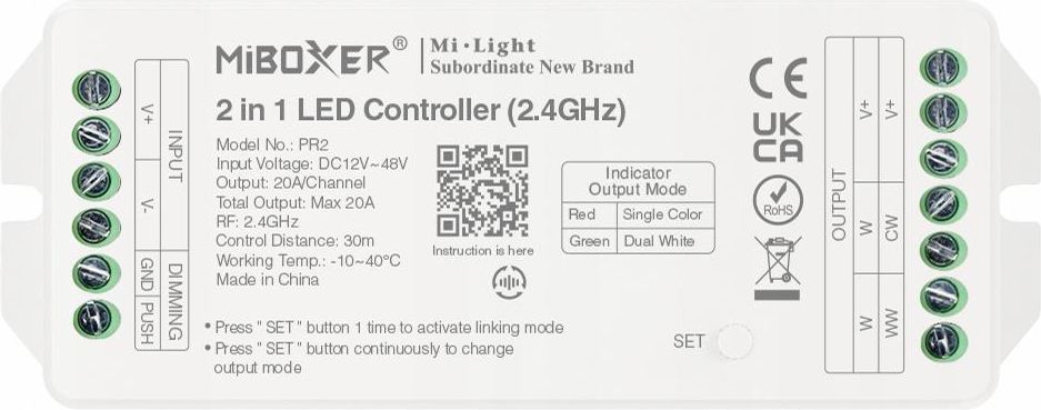 Kontroler LED MiBoxer PR2 Jeden kolor / podwójny biały CCT / 12-48VDC / 2x20A (total max. 20A) / IP20 Kontroler 2 w 1 MiBoxer PR2, sterowany radiowo pilotem za pomocą transmisji 2,4 GHz. Maksymalny zasięg sterowania do 30 m. Obsługiwane funkcje • 2 tryby wyjściowe: jeden kolor / podwójny biały CCT, …