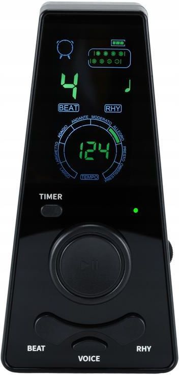 Metronom cyfrowy MusicMate MM-DRM055 RhythmWizard Metronom cyfrowy zasilanie: DC 5V (USB-C) lub baterie 3 x AAA (nie znajdują się w zestawie) możliwość ustawienia rytmu, taktu, tempa, głosu, oraz szybkości uderzeń (od 40 do 208 na minutę) kolorowy wyświetlacz wyjście słuchawkowe Jack 3,5mm regulacja głośności timer waga: 150g kabel USB w zestawie niezastąpione wsparcie w rozwijaniu umiejętności muzycznych, pomaga utrzymać idealne tempo i stanowi nieocenione wsparcie przy nauce i ćwiczeniach muzyczno-wokalnych Nowoczesny Design i Funkcjonalność Metronom RhythmWizard MM-DRM055 od MusicMate to nowoczesne i praktyczne urządzenie, które idealnie wspiera rozwój muzycznych umiejętności. Z jego pomocą precyzyjnie ustawisz rytm, tempo, takt i głos, co umożliwi utrzymanie doskonałego tempa w trakcie nauki, gry lub ćwiczeń. Lekka konstrukcja i kompaktowe wymiary sprawiają, że jest łatwy w przenoszeniu, co czyni go niezastąpionym narzędziem zarówno w domu, jak i na próbach. Kolorowy Wyświetlacz i Wygoda Obsługi Metronom wyposażony jest w czytelny kolorowy wyświetlacz, który zapewnia szybki dostęp do wszystkich najważniejszych ustawień, takich jak tempo, rytm i takt. Dzięki wyjściu słuchawkowemu 3,5 mm, użytkownicy mogą cieszyć się cichymi ćwiczeniami, nie przeszkadzając innym osobom. Intuicyjny interfejs oraz precyzyjnie zaprojektowane przyciski pozwalają na łatwe i płynne dostosowanie parametrów do indywidualnych potrzeb, co sprawia, że korzystanie z urządzenia jest niezwykle komfortowe i szybkie. Wszechstronność i Elastyczność Zasilania RhythmWizard MM-DRM055 oferuje pełną elastyczność zasilania — można go zasilać za pomocą USB-C lub trzech baterii AAA, co pozwala na swobodne korzystanie z urządzenia w dowolnym miejscu. Co więcej kabel USB sprawia, że urządzenie jest gotowe do działania od razu po wyjęciu z pudełka. Dzięki lekkości (150g) i kompaktowej budowie, RhythmWizard jest niezwykle wygodnym i niezastąpionym narzędziem do nauki i codziennych ćwiczeń. Precyzja i Efektywność Metronom ten został zaprojektowany, aby wspierać Cię w rozwijaniu muzycznych umiejętności. Dodatkowo, dzięki funkcji timer, możesz precyzyjnie zarządzać czasem trwania sesji ćwiczeniowych, co pomaga zoptymalizować Twoje postępy. Możesz wybierać z pośród 4 ustawień czasu: 15, 30, 45 i 60 min. Urządzenie umożliwia także ustawienie tempa od 40 do 208 uderzeń na minutę, co czyni je doskonałym wyborem dla muzyków na każdym poziomie zaawansowania.