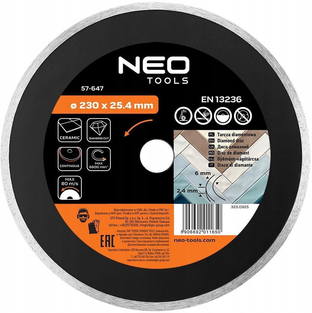 Solidna tarcza diamentowa ze średnicą 230 mm oraz średnicą otworu 25,4 mm od marki NEO TOOLS, polecana do przycinarki do glazury GRAPHITE. Umożliwia wygodne cięcie na mokro, przy maksymalnej prędkości 6600 obrotów na minutę. Tarcza rekomendowana jest do pracy z twardymi oraz kruchymi materiałami; takimi jak ceramika. Za sprawą prasowanego na gorąco diamentowego segmentu o wysokości 6 mm i grubości 2,4 mm dobrze sprawdzi się na placach budowy.