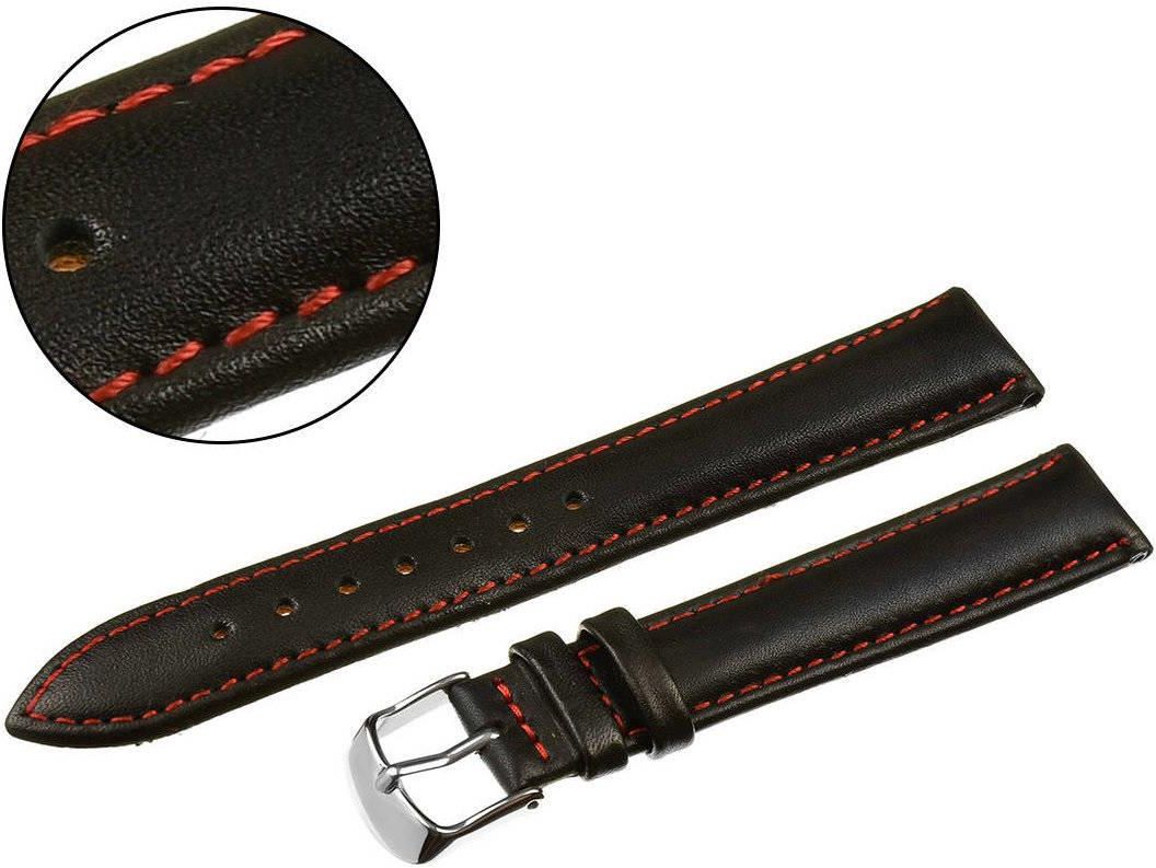 Skórzany pasek do zegarka Pasuje do modelu SmartWatch oraz zegarków kwarcowych, gdzie szerokość mocowania paska wynosi 20 mm Pasek skóra naturalna. Klamerka stalowa w kolorze srebrnym. Materiał: Skóra naturalna. Kolorystyka: Kolor czarny, z czerwonym przeszyciem. Wymiary: szerokość mocowania: 20 mm długość części z klamerką: 79 mm długość części z dziurkami: 124 mm