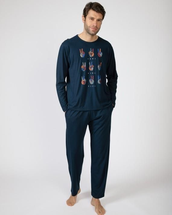Piżama Caballero Massana P751314 – kolor marino Piżama męska Massana P751314 to komfortowy, klasyczny komplet wykonany w 100% z miękkiej, oddychającej bawełny typu jersey. To idealna propozycja dla mężczyzny, który ceni naturalne materiały, swobodny krój i wygodę przez całą noc. Model utrzymany jest w głębokim granatowym kolorze, który prezentuje się elegancko i ponadczasowo. Górną część zestawu stanowi koszulka z długim rękawem i okrągłym dekoltem. Na froncie znajduje się ciekawy, kolorowy nadruk przedstawiający różne układy dłoni w stylu graffiti oraz napis VENI VIDI VICI , który nadaje piżamie nowoczesny, młodzieżowy charakter. Materiał jest miękki, przyjemny w dotyku i zapewnia doskonałą cyrkulację powietrza. Spodnie są gładkie, w tym samym odcieniu granatu. Mają elastyczną talię i praktyczne boczne kieszenie, dzięki czemu świetnie dopasowują się do sylwetki i gwarantują pełną wygodę użytkowania. To piżama, która idealnie sprawdzi się zarówno do spania, jak i domowego relaksu. Stylowa, miękka i bardzo wygodna – idealna dla każdego mężczyzny. Cechy produktu: model: Massana P751314 kolor: marino (granatowy) materiał: 100% bawełna koszulka z długim rękawem i okrągłym dekoltem nadruk z motywem dłoni i napisem VENI VIDI VICI spodnie długie, gładkie, z kieszeniami i elastyczną talią naturalny, przewiewny materiał jersey idealna na cały rok – dla miłośników wygody Dlaczego warto? w 100% naturalna tkanina przyjazna dla skóry miękka, oddychająca bawełna zapewnia komfort snu nowoczesny nadruk nadaje stylu elastyczna talia i kieszenie zwiększają wygodę świetna na prezent i do codziennego użytku Pielęgnacja: Należy stosować się do zaleceń z metki, aby materiał zachował swoje właściwości i kolor. Zdjęcie aranżacyjne ma charakter poglądowy. Prezentowana aranżacja może zawierać elementy dekoracyjne niewchodzące w skład zestawu. Szczegóły dotyczące zawartości znajdują się w opisie produktu.