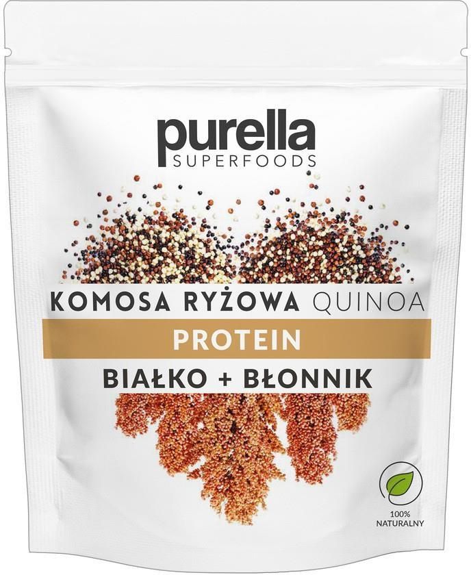 Purella Superfoods, komosa ryżowa trójkolorowa – połączenie trzech odmian – białej, czerwonej i czarnej. Stanowi źródło białka i błonnika pokarmowego. Dzięki swojej delikatnej, lekko orzechowej nucie smakowej oraz wszechstronnemu zastosowaniu kulinarnemu, jest ceniona w kuchniach całego świata. Produkt w 100% naturalny, odpowiedni dla wegan.