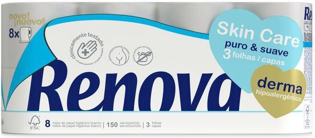 Papier toaletowy Renova Skin Care Derma 8 rolek Renova Skin Care Derma to rewolucyjny papier toaletowy, stworzony z myślą o najbardziej wrażliwej skórze. W opakowaniu z 8 rolekami zapewnia wygodę na długi czas. Ten hipoalergiczny produkt gwarantuje minimalne ryzyko podrażnień i alergii, dbając o Twoje bezpieczeństwo. Renova Skin Care Derma przeszedł rygorystyczne testy kliniczne na skórze wrażliwej, w tym na skórze atopowej, potwierdzając swoją skuteczność i łagodność. Ciesz się komfortem, pielęgnacją i bezpieczeństwem, korzystając z papieru toaletowego Renova Skin Care Derma. Biały papier toaletowy Wyjątkowo miękki i chłonny 8 rolek w opakowaniu Bez zapachu 3 warstwowy 150 arkuszy na rolkę 17,3 m na rolkę Przebadany dermatologicznie Posiada certyfikat FSC C136137 Wymiary opakowania: 46 x 11,5 x 19cm Ten produkt jest wykonany z certyfikowanego FSC® i innego kontrolowanego materiału. Wybierając ten produkt, wspierasz odpowiedzialne zarządzanie lasami na świecie. Producent: Renova Kod EAN: 5601028031974 Kraj pochodzenia: Portugalia