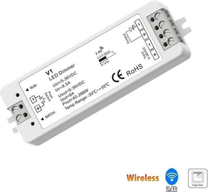V1 - Odbiornik radiowy 2,4GHz do taśmy LED MONO V1 to 1-kanałowy odbiornik LED przeznaczony do ściemniania i rozjaśniania oświetlenia monochromatycznego np. jednokolorowe taśmy LED współpracujący z bezprzewodowymi pilotami, naściennymi panelami LED, a także przełącznikami zwiernymi (PUSH-DIM). Ściemniacz V1 wyposażono w funkcję autotransmisji polegającą na tym, że jeden sterownik przekazuje sygnał do innego kontrolera oddalonego o 30 metrów. Zsynchronizowany sygnał na poziomie odbiornika to stabilna praca wszystkich podłączonych opraw oświetleniowych. Zewnętrzny przycisk PUSH oraz bezprzewodowy pilot czy panel realizują funkcje ściemniania 0-100% oraz włącz / wyłącz. Urządzenie posiada zabezpieczenie przed przegrzaniem, przeciążeniem i zwarciem. Odbiornik zasilany jest z szerokiego zakresu napięcia 5-36VDC (zasilacze stałonapięciowe) i może być obciążony maksymalnym prądem 8A. Szczegółowe dane zawarte są w dołączonej karcie katalogowej producenta. Cechy ściemniacza V1 SKYDANCE • przeznaczony do oświetlenia monochromatycznego np. jednokolorowe taśmy LED• zakres napięcia zasilania 5-36V DC• napięcie wyjściowe 5-36V DC• maksymalny prąd wyjściowy 8A• możliwość sterowania w jednej strefie oświetleniowej• komunikacja radiowa o zasięgu do 30 metrów ( możliwość zwiększenia dzięki autotransmisji)• ściemnianie PUSH (zewnętrzny stycznik np. przycisk dzwonkowy)• możliwość przypisania do 10 urządzeń nadawczych takich jak piloty czy panele naścienne LED• po dokupieniu odpowiedniego modułu współpraca także z Wi-Fi• dzięki PWM płynna regulacja jasności 0-100% (4096 poziomów ściemniania)• szereg zabezpieczeń • mała obudowa z zaczepami montażowymi• wysoka jakość wykonania• zgodność z certyfikatem EU-RED• gwarancja 5 lat Wymiary i wyprowadzenia Sposób połączeń Dlaczego warto kupić odbiornik LED V1? Ten wysokiej klasy odbiornik LED zapewnia wygodną regulację jasności oświetlenia przy pomocy pilotów lub paneli LED do zdalnego sterowania, a także manualnych przełączników przyciskowych (metoda PUSH-DIM). Kontroler ściemniania V1 charakteryzuje się małą kompaktową obudową wygodną w montażu. Posiada dodatkowe zabezpieczenie przed odwrotną polaryzacją. Może pracować w szerokim zakresie temperatur -30 do +55°C . Częstotliwość PWM 500Hz zapewni płynną regulację jasności oświetlenia bezpieczną dla naszego wzroku. Ściemniacz LED V1 zgodny jest certyfikatem EU-RED i posiada 5 letnią gwarancję. Zakup tego urządzenia ściemniającego to udana i trafiona inwestycja. Wygodne sterowanie oświetleniem monochromatycznym. Możliwość sterowania przyciskiem zwiernym (PUSH-DIM)