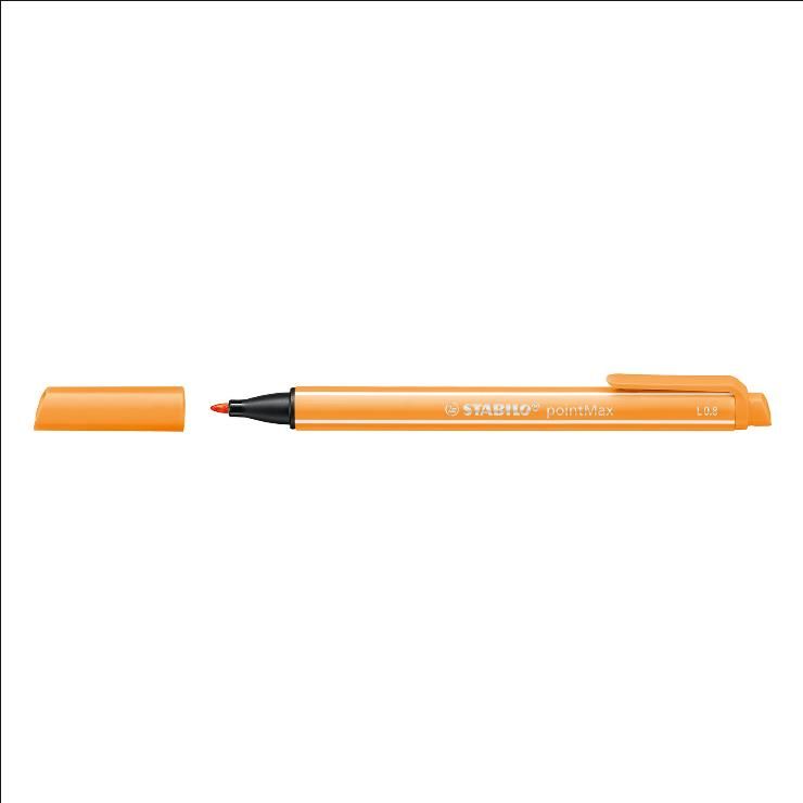 STABILO pointMax - nowa odsłona kultowego już cienkopisu STABILO. Cienkopis posiada obudowę w kolorze tuszu z charakterystycznymi dla STABILO jasnymi pasami, praktyczny klips i nylonową końcówka o grubości 0,8 mm idealną do pisania, rysowania, szkicowania i podkreślania. Stworzony z myślą o uczniach i studentach oraz tych którzy dużo piszą. Idealny do tworzenia map myśli i kolorowych notatek ułatwiających zapamiętywanie. Cienkopis dostępny jest w 24 intensywnych kolorach. Kolor pomarańczowy.