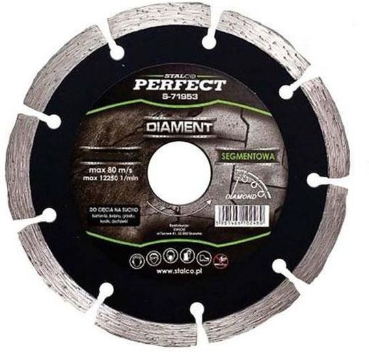 Tarcza diamentowa segmentowa Perfekt do cięcia na sucho Stalco 115x1,8mm S-71951 Profesjonalna tarcza diamentowa segmentowa to narzędzie potrzebne do cięcia twardych materiałów. Jej konstrukcja dostosowana jest do cięcia pilarkami, szlifierkami kątowymi i innymi narzędziami o podobnym działaniu. Budowa tarczy składa się z segmentów, które ułatwiają cięcie kamienia, betonu lub kostki brukowej. Zapobiegają przegrzewaniu się tarczy przy cięciu na sucho. Tarcza diamentowa segmentowa z linii STALCO PERFECT jest bardzo trwała i żywotna, co sprawdzi się przy częstym profesjonalnym cięciu. Linia Perfect to produkty najwyższej jakości gwarantujące sprawne wykonanie pracy, oraz długą żywotność. Stworzone dla wymagających Można wybrać jeden z rozmiarów tarczy, który różni się przede wszystkim średnicą zewnętrzną. Pozwala to dopasować ja do rodzaju i wielkości elektronarzędzi. Charakterystyka długa żywotność produktu zmniejsza koszty związane z koniecznością zakupu kolejnych tarcz. do cięcia na sucho materiał produktu: stal węglowa, diament cięcie kamienia, pustaków, betonu, granitu, dachówki, kostki. średnica tarczy: 115 mm grubość tarczy: 1,8 mm średnica otworu: 22,23 mm wysokość segmentu: 800 dopuszczalna prędkość: MAX 80m/s prędkość obrotowa:13300 1/min