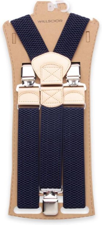 Klasyczne granatowe szelki męskie z zapięciem na żabki i beżowymi wykończeniami
