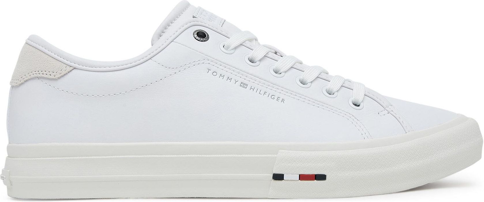 Trampki męskie Tommy Hilfiger Street Leather Stitch white łączą w sobie sportową stylistykę z wysoką dbałością o detale wykonania. Cholewka powstała ze skóry, zapewniając ponadprzeciętną trwałość i komfort noszenia nawet podczas intensywnego użytkowania. Skórzana cholewka i wytrzymałość Materiał cholewki stanowi wysokogatunkowa skóra, która gwarantuje optymalne dopasowanie do stopy i podnosi odporność na codzienne użytkowanie. Naturalna struktura skóry poprawia oddychalność, a także zapewnia przyjemne uczucie kontaktu z materiałem. Dzięki temu model Tommy Hilfiger Street Leather Stitch utrzymuje estetyczny wygląd przez długi czas. Komfort użytkowania i funkcjonalność Wkładka w tym modelu jest wyjmowana, co ułatwia indywidualne dopasowanie lub wymianę na rozwiązania ortopedyczne. Niska wysokość cholewki wspiera swobodę ruchów i sprzyja dynamicznemu przemieszczaniu się. Klasyczne sznurowanie pozwala na precyzyjną regulację stopnia dopasowania do stopy użytkownika. Trampki męskie Tommy Hilfiger Street Leather Stitch white - cechy: Cholewka wykonana z wysokogatunkowej, naturalnej skóry licowej; Podeszwa zewnętrzna z trwałej i elastycznej gumy; Niska konstrukcja cholewki dla swobody ruchów; Męski fason dopasowany do potrzeb dynamicznych aktywności; Wytrzymałe materiały odporne na intensywne użytkowanie; Dopracowane detale charakterystyczne dla marki Tommy Hilfiger.