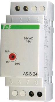 Przeznaczenie: Automat schodowy (wyłącznik czasowy) AS-B220 służy do utrzymania włączonego oświetlenia korytarzy, klatek schodowych, lub innych obiektów przez określony czas, po upływie którego oświetlenie zostanie wyłączone automatycznie. AS-B 24 nie może współpracować z wyłącznikami podswietlanymi. Działanie Załączony wyłącznikiem chwilowym (dzwonkowym) automat schodowy podtrzymuje oświetlenie przez czas ustawiony potencjometrem (od 0,5min. do 10min.). Po upływie nastawionego czasu automat wyłączy oświetlenie samoczynnie. Po wyłączeniu oświetlenia możemy je załączyć ponownie. Dane techniczne zasilanie: 24V AC maks. prąd odbiorników: <16A opóźnienie wyłączenia – regulowane: 0,5÷10min opóźnienie zadziałania: <1s pobór mocy: 0,56W przyłącze: zaciski śrubowe 4mm2 wytrzymałość: 105 przełączeń temperatura pracy: -25÷50oC wymiary: 2 moduły (35mm) mocowanie: na szynie TH-35
