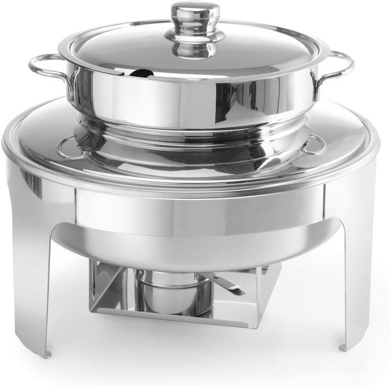 Podgrzewacz stołowy do zup na pastę. Pojemność 10 l. Podgrzewany paliwem. Wykonany w całości ze stali nierdzewnej wysokopolerowanej. W wyposażeniu pojemnik na wodę, okrągły pojemnik na zupę oraz puszka na paliwo. Pokrywa pojemnika z wycięciem na chochelkę. Uwaga: Paliwo należy dokupić oddzielnie.