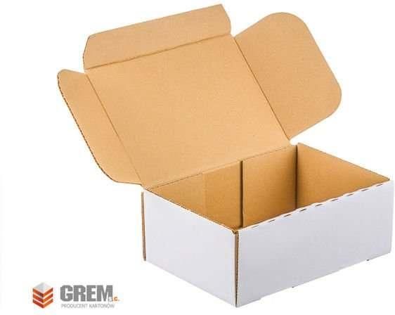 Komplet 10 sztuk białych pudeł kartonowych fasonowych o wymiarach zew. 200x150x80 mm (dł/szer/wys). Opakowania wykonane są z trzywarstwowej tektury falistej (fala B) o gramaturze 380 g/m2.