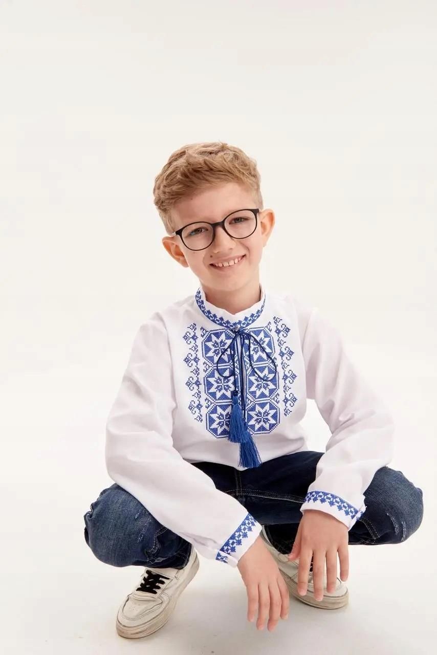 Koszula dla chłopaka z jakościowej bawełny, wykonana bardzo starannie i stylowo. Wygodny krój, piękny haftowany wzór. Haft maszynowy wysokogatunkowy - nie "sciąga się" po praniu, nie puszcza koloru, od strony wewnętrznej jest mięciutki. Koszula w stylu folkowym, "wyszywanka" w stylu ludowym Ukrainy. 100% bawełna. Wyprodukowane w Ukrainie. Oryginalne autentyczne ukraińskie wzornictwo. Dzięki zastosowaniu wysokiej jakości materiału oferowane produkty zapewnią wygodę i komfort noszenia. Tablica rozmiarów (zalecane kupowanie o jeden/dwa rozmiary większy niz nosi dziecko, rozmiary są mocno zawyżone) : Rozmiar, Wzrost, Szerokość w piersiach, Szerokość w ramionach, Długość rękawa, Długość wyrobu 1 rok 86: 32, 26, 28, 36 2 latka 92: 34, 27, 33, 41 3 latka 98: 36.5, 29, 37, 45 4 lata 104: 40, 30,5, 39, 47 5 lat 110: 41, 32, 41, 51 6 lat 116: 41.5, 32,5, 43, 52 7 lat 122: 44, 33, 46, 55 8 lat 128: 44, 33,5, 47, 57 9 lat 134: 46, 35, 48, 59 10 lat 140: 46, 36, 51, 60 11 lat 146: 47, 37, 52, 62 12 lat 152: 48, 38, 52,5, 64 Zapraszam serdecznie po więcej ofert slawna.pl