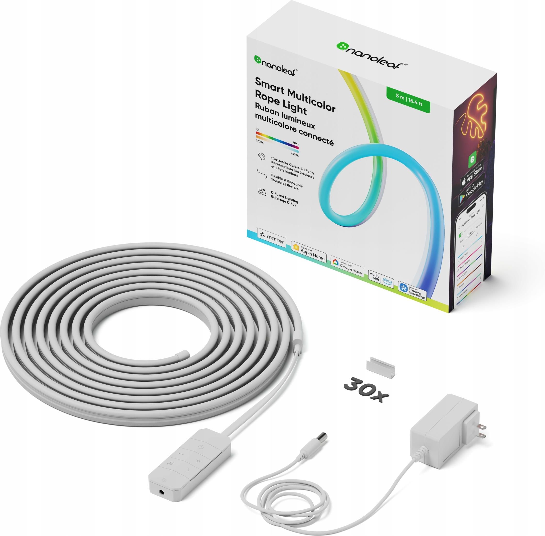 Nanoleaf Smart Multicolour Rope Light - elastyczna, inteligentna, neonowa listwa LED 5 m Nowoczesne oświetlenie dekoracyjne – elastyczność, styl i technologia w jednym Nanoleaf Rope Light to inteligentna taśma LED, która redefiniuje sposób, w jaki myślisz o oświetleniu. Jej elastyczna konstrukcja pozwala tworzyć dowolne kształty i wzory – od klasycznych symboli po artystyczne, abstrakcyjne formy. Dzięki temu Twoja ściana może zamienić się w interaktywną instalację świetlną. Dekoracja, która nie tylko świeci, ale także wyraża Twój styl i osobowość. Spektakularne efekty świetlne – 16 milionów kolorów i dynamiczne animacje Przygotuj się na prawdziwe wow – Rope Light oferuje ponad 16 milionów kolorów, które możesz dowolnie miksować i animować. Dzięki technologii RGBIC, każde z 70 stref oświetleniowych może świecić w innym kolorze, tworząc niesamowite przejścia i efekty. Silikonowa osłona równomiernie rozprasza światło, zapewniając miękkie, przyjemne dla oka iluminacje. Personalizacja bez ograniczeń – światło, które dopasowuje się do Ciebie Zmieniaj atmosferę w pomieszczeniu jednym kliknięciem! Aplikacja Nanoleaf daje Ci pełną kontrolę nad kolorami, trybami świecenia i animacjami. Możesz tworzyć własne sceny lub korzystać z gotowych motywów. Dodatkowo Rope Light reaguje na muzykę – każdy dźwięk ożywia światło, nadając pomieszczeniu dynamiczny, klubowy klimat. Zanurz się w obrazie – funkcja Screen Mirror i efekty immersyjne Z Nanoleaf Rope Light Twoje doświadczenia z grami, filmami i muzyką wchodzą na nowy poziom. Funkcja Screen Mirror synchronizuje kolory taśmy z obrazem na ekranie komputera lub telewizora. Tworzysz tym samym efekt świetlnej otoczki, która wciąga Cię w akcję i intensyfikuje emocje. Idealne do pokoju gracza, domowego kina lub setupu streamingowego. Inteligentne sterowanie – wybierz sposób, który lubisz najbardziej Kontroluj światło tak, jak Ci wygodnie. Rope Light współpracuje z najpopularniejszymi systemami smart home: Apple HomeKit, Google Home, Amazon Alexa, Samsung SmartThings oraz Razer Chroma RGB. Sterujesz za pomocą aplikacji (iOS, Android, Windows, Mac), głosowo (Siri, Asystent Google, Alexa) lub fizycznym kontrolerem. Szybka konfiguracja bez potrzeby skomplikowanego montażu. Specyfikacja techniczna – poznaj możliwości Nanoleaf Rope Light Długość taśmy: 5 m Wymiary: szerokość 6 mm, wysokość 15 mm Długość kabla zasilającego: 1,5 m Waga: Taśma – 560 g, Zasilacz – 110 g, Kontroler – 43 g Rozstaw diod LED: 11,9 mm Liczba diod LED: 420 Strefy kolorów: 70 niezależnych stref RGBIC Jasność: 300 lumenów Temperatura barwowa: od 2700K (ciepła) do 6500K (zimna) Kolory: Ponad 16 milionów barw Żywotność: do 25 000 godzin Zasilanie: 200–240V, 50/60Hz Wilgotność robocza: 10–90% Temperatura pracy: 0°C – 45°C Stopień ochrony: IP20 – do użytku wewnętrznego Zaawansowane opcje sterowania – pełna kontrola nad oświetleniem Łączność: Wi-Fi 2.4 GHz, Bluetooth, Matter over Wi-Fi Kompatybilność: Apple Home, Google Home, Amazon Alexa, Samsung SmartThings, Razer Chroma Sterowanie: aplikacja Nanoleaf (iOS, Android, Windows, Mac), głosowe, przycisk na kontrolerze Ściemnianie: Tak – przez aplikację, głos lub fizyczny przycisk Zawartość zestawu – wszystko, czego potrzebujesz do startu 1x Nanoleaf Multicolour Rope Light (5 metrów) 1x Kontroler 30x Uchwyty montażowe 30x Śrubki 1x Zasilacz Dlaczego warto wybrać Nanoleaf Rope Light? Elastyczny design do dowolnych aranżacji Reakcja na dźwięk i obraz Zaawansowane efekty świetlne i immersyjne Kompatybilność z ekosystemami smart home Szybka i intuicyjna obsługa Doskonała do dekoracji salonu, sypialni, biura i pokoju gracza Zamień swoje wnętrze w świetlną galerię – z Nanoleaf Rope Light wszystko jest możliwe.