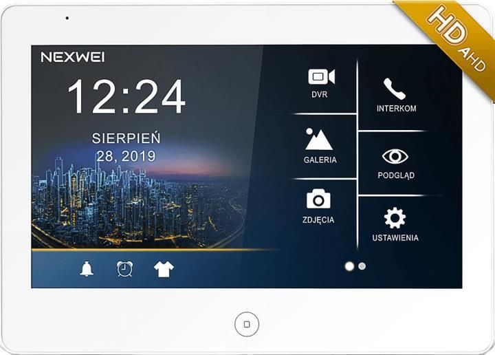 Wideomonitor NEXWEI NW-VI10S-WW 10" Wideomonitor NW-VI10S-WW marki NEXWEI w białej obudowie. Wyposażony jest w dotykowy ekran LCD o przekątnej 10 cali, który wyświetla obraz w rozdzielczości Full HD. Posiada kilka aplikacji użytkowych, między innymi: kalendarz, zegar, alarm czy budzik. Umożliwia też ustawienie własnej tapety oraz wgrywanie dowolnych plików mp3 i przypisanie ich do dzwonka. Urządzenie ma slot na kartę pamięci microSD - obsługuje nośniki o pojemności maksymalnie 128 GB. System wideodomofonowy, poza tym monitorem, może mieć podłączone maksymalnie 2 monitory, 2 panele zewnętrzne, a także dwie kamery CCTV. W porównaniu do podstawowej wersji monitora, NW-VI10S-WW posiada wbudowany moduł WiFi. Pozwala on na bezprzewodową obsługę wideodomofonu przy uzyciu aplikacji TUYA SMART. Funkcje, w które wyposażony został panel NW-VI10S-WW: zostawianie wiadomości głosowych wybór języka menu (polski, angielski, rosyjski) odtwarzacz multimedialny regulacja głośności rozmowy (10 stopni) interkom (adresowalny lub zbiorowy) komunikat głosowy dla odwiedzających podczas nieobecności własne tapety (pliki .jpg do 300 kB) alarm i budzik (maksymalnie 4) zegar i kalendarz nasłuch poprzez inne monitory z możliwością wyłączenia Dane techniczne - NEXWEI NW-VI10S-WW: