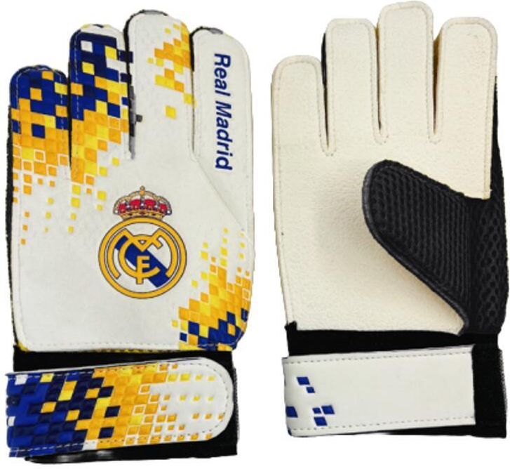 REAL MADRYT Rękawice bramkarskie dla dzieci rozmiar XS 5 według producenta na wzrost 116/128 dedykowane na wiek 6-8 lat bardzo lekkie materiał - PCV spód rękawic - pianka regulacja nadgarstka na przylepiec-rzep kolor - biały, odcienie niebieskiego, żółtego oryginalne na licencji RM nadrukowane logo hologram Oficjalne rękawice dla fanów Real Madryt Z pewnością świetnie sprawdzi się jako prezent dla fanów Real Madryt.