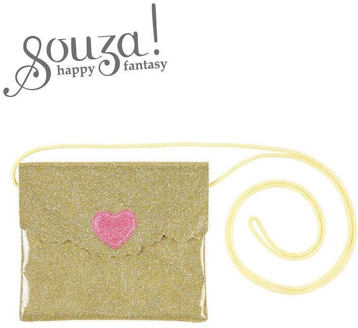 Torebka na ramię dla dzieci złota kopertówka Femke holenderskiej marki Souza! Cechy: - połyskująca złota torebka z tworzywa w kształcie koperty z ozdobną klapką - długi (ok. 50 cm) jasnożółty pasek ze sznurka - na klapce aplikacja: różowe serduszko - poręczna i dość pojemna (mieści niezbędne …