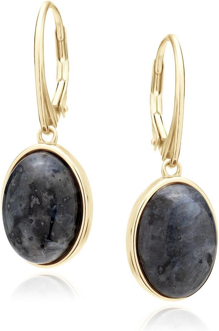 Eleganckie wykonane z pozłacanego srebra wiszące kolczyki na angielskim zapięciu, z owalną ozdobą wysadzaną czarnym jadeitem.