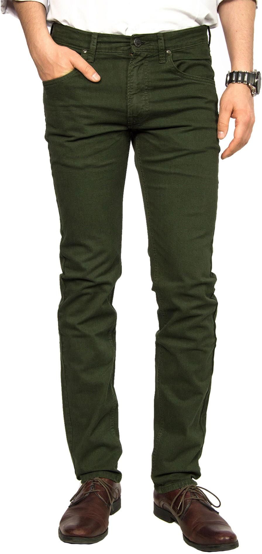 Kolor ciemno - zielony, jednolity - bez wytarć. Uwagę zwracają prostotą, połączoną jednocześnie z ogromnym wyrafinowaniem. Perfekcyjne, ręczne wykończenia i najwyższej jakości materiał, gwarantuje marka Lee. Tylna prawa strona spodni upiększona stylową skórzaną naszywką z grawerowanym logo producenta. Obszycia stebnowane mocnymi szarymi nićmi, podkreślają ten świetny krój i kolor spodni. O ile cenisz sobie jakość i lubisz się nieco wyróżnić, Koniecznie musisz je mieć! Bardzo uniwersalne - do marynarki, swetra, A także do koszuli, bluzy, czy t-shirtu. Zarówno do pantofli, obuwia sportowego, jak i do butów zimowych, sztybletów itp... Jakkolwiek, nosząc je przez cały dzień, to dzięki świetnemu krojowi, A także minimalnej ilości stretchu, będziesz się czuł bardzo komfortowo.