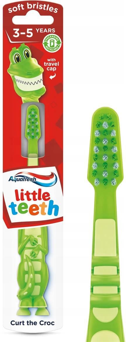 AQUAFRESH Szczoteczka do zębów Little Teeth 3-5 lat AQUAFRESH Little Teeth to nie tylko zwykła szczoteczka, ale prawdziwy przyjaciel małych ząbków, które każdego dnia wymagają starannej pielęgnacji! Ta unikalna szczoteczka została stworzona przez lekarzy dentystów z myślą o dzieciach w wieku 3-5 lat, co czyni ją idealnym narzędziem do dbania o delikatne zęby mleczne. Dzięki miękkim włoskom, AQUAFRESH Little Teeth skutecznie usuwa osad, bakterie oraz resztki jedzenia, jednocześnie minimalizując ryzyko podrażnień wrażliwych dziąseł. To oznacza, że codzienne szczotkowanie zębów staje się nie tylko skuteczne, ale i bezpieczne dla Twojego dziecka. Co więcej, rączka oraz osłona główki szczoteczki tworzą zabawną postać, która z pewnością stanie się ulubieńcem Twojego malucha. Dzięki temu codzienna higiena jamy ustnej stanie się przyjemnością, a ząbki będą zdrowsze i mocniejsze! Zaleca się wymianę szczoteczki co 3 miesiące. Sposób użycia: przestrzegać instrukcji podanych na opakowaniu. Szczotkować zęby dwa razy dziennie. Szczotkowanie powinno odbywać się pod kontrolą dorosłych.