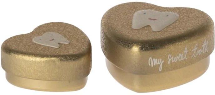 Pudełeczka - Tooth box, 2 pcs set - Gold Zestaw pięknych metalowych pudełeczek w kształcie serca skryją niejeden skarb malucha. Mailegowy złoty wzór dodaje uroku i tajemniczości małym pudełeczkom. Wielkość większego pudełeczka: 2,5x5 cm