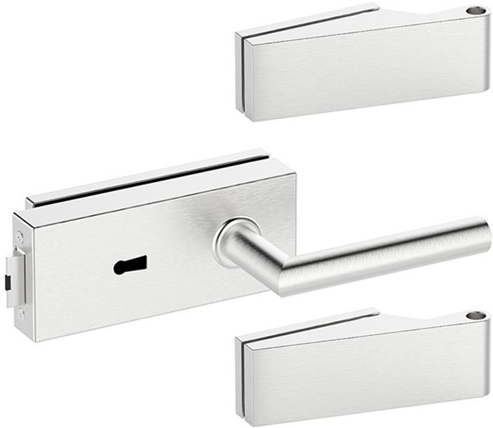 Komplet okuć do drzwi szklanych o grubości 8 mm. Na klucz. Stal nierdzewna AISI 304, wykończenie w kolorze inox. Drzwi o maksymalnych wymiarach: wys. 2000 mm; szer. 800 mm. Stronność: lewa / prawa. Zawiera: zamek, klamkę,2x zawiasy do szkła, klucze.