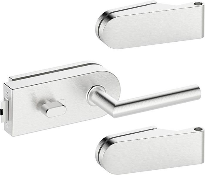 Komplet okuć do drzwi szklanych o grubości 8 mm. Blokada WC. Stal nierdzewna AISI 304, wykończenie w kolorze inox. Drzwi o maksymalnych wymiarach: wys. 2000 mm; szer. 800 mm. Stronność: lewa / prawa. Zawiera: zamek, klamkę,2x zawiasy do szkła.