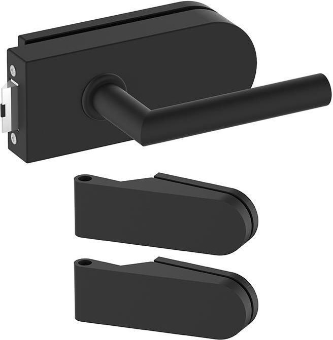 Komplet okuć do drzwi szklanych o grubości 8 mm. Bez przebicia. Stal nierdzewna AISI 304, wykończenie w kolorze czarnym. Drzwi o maksymalnych wymiarach: wys. 2000 mm; szer. 800 mm. Stronność: lewa / prawa. Zawiera: zamek, klamkę,2x zawiasy do szkła