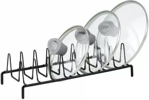 Cechy i zalety: - Praktyczny organizer na 8 pokrywek. - Dzięki niemu szybko i łatwo wyciągniemy właściwą pokrywkę. - Zapobiega uszkodzeniom pokrywek. - Można stosować w szafce, szufladzie, na półce. - Oszczędza miejsce i wprowadza porządek w szafce Specyfikacja: - Materiał: drut stalowy malowany proszkowo na kolor czarny matowy - Wymiary: 33 x 10,8 x 9 cm - Kolor: czarny