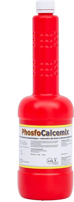 PhosfoCalcemix Mieszanka paszowa uzupełniająca dla krów 1 kg Phosfo Calcemix - Zastosowanie Utrzymuje fosfor i wapń na odpowiednim poziomie w organizmach krów wysokowydajnych, Stosowana wspomagająco w okresie zalegań poporodowych u bydła. Phosfo Calcemix - Zawartość Materiały paszowe Gliceryna 99%, Glikolpropylenowy, Chlorek wapnia, Siarczan magnezu, Oleje i tłuszcze roślinne, Trójpolifosforan sodu, Fosforan jednowapniowy. Składniki analityczne (w 1 kg) Popiół surowy 428 g, Wapń 57 g, Sód 20 g, Fosfor 67 g, Magnez 6 g. Dodatki paszowe w 1 kg Kwas nikotynowy (niacyna) 6,00 g, Witamina B12 500,00 μg, Mrówczan wapnia 20,00 g, Wilgotność 26%. Phosfo Calcemix - Sposób Użycia Sposób przygotowania i podawania Przed zastosowaniem lub przed przedłużeniem okresu stosowania należy zasięgnąć opinii specjalisty ds. żywienia lub lekarza weterynarii, Przed użyciem wstrząsnąć, Jednorazowa porcja 400/500 g. Dawkowanie Zależnie od potrzeb, zalecane jedna porcja przy porodzie oraz porcja 6-12 godzin po porodzie, W razie potrzeby kontynuować podawanie przez 3-4 dni, Paszę podawać z paszą podstawową (dobrze wymieszać) lub bezpośrednio do pyska. Przechowywanie Produkt należy przechowywać w temperaturze pokojowej, w ciemnym miejscu.