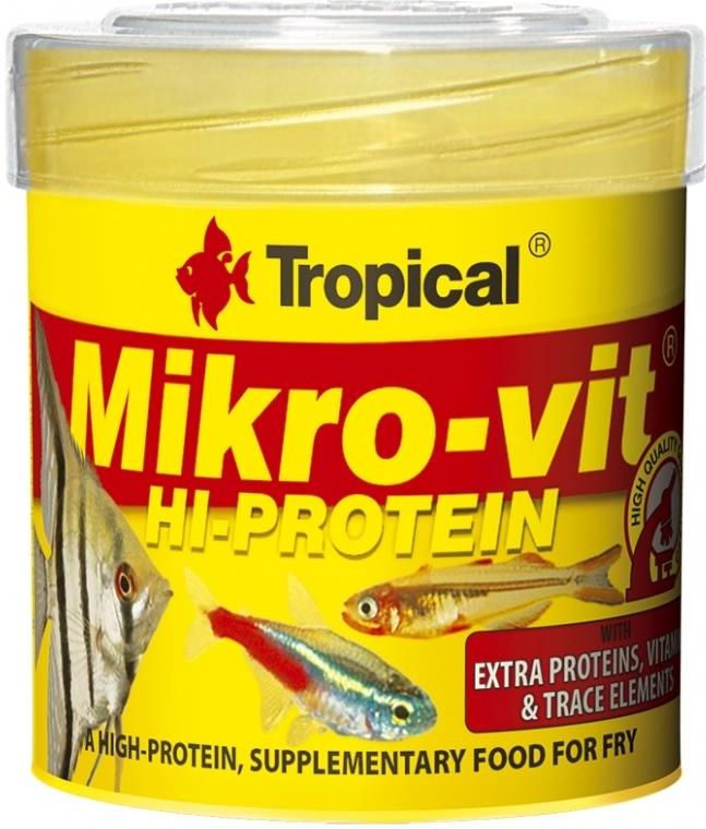Tropical Mikro-Vit Hi Protein 50ml - Opis Produktu Mikro-Vit Hi-Protein to wysokobiałkowy, podstawowy pokarm dla narybku z żółtkami jaj. Linia Premium to gotowe pokarmy z wieloma atrakcyjnymi dodatkami, które zapewniają rybom m.in. doskonałą kondycję, piękne kolory i większą odporność na choroby. …