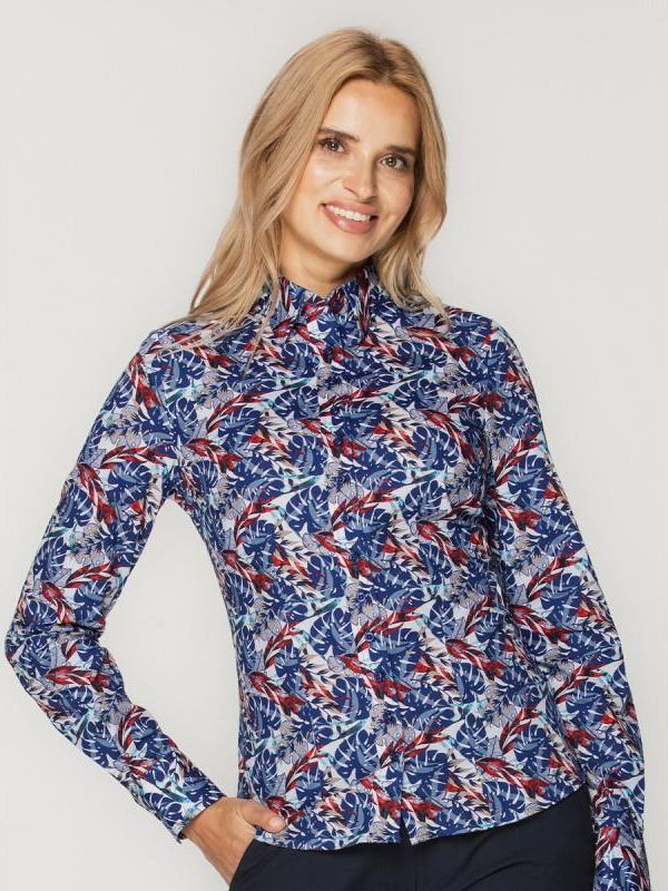 Biała, taliowana koszula damska w granatowe i czerwone liście z krytym, podpinanym kołnierzykiem