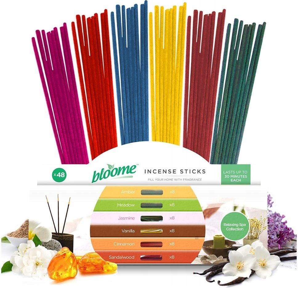 Kadzidełka zapachowe wypełnią pomieszczenia przepięknym zapachem. Sposób użycia: Zapal końcówkę kadzidełka. Kiedy pojawi się płomień, zdmuchnij go i umieść kadzidełko na odpowiedniej podstawce (nie dołączonej do zestawu) Zestaw zawiera 6 zapachów po 8 sztuk kadzidełek. Łącznie w zestawie jest 48 sztuk kadzidełek. Kolekcja relaksacyjna SPA zawiera złoty bursztyn letnia łąka biały jaśmin kojąca wanilia cynamon drzewo sandałowe Każde kadzidełko działa do 30 minut. Uwaga! Nie ma możliwości wyboru pojedynczych zapachów. Zestaw zawiera każdy z sześciu wskazanych zapachów.