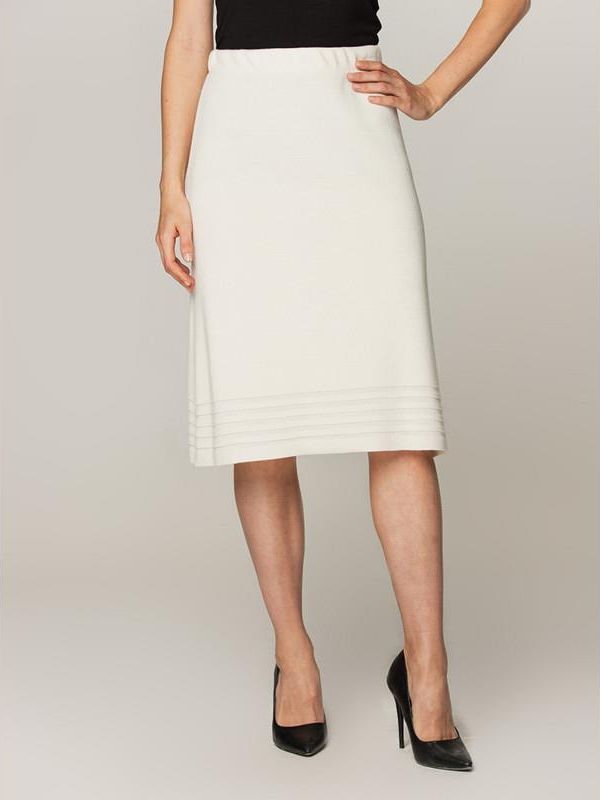 Lekko rozszerzana, wełniana spódnica Jednokolorowa wełniana spódnica na gumce, o kształcie litery A i długości do kolan. Sweterkowa dzianina z dodatkiem wełny posiada tłoczone, ozdobne paski, dzięki czemu spódnica zyskała oryginalny wygląd. Posiada podszewkę. Świetnie komponuje się z wpuszczoną koszulą bądź topem i swetrem, bądź kardiganem. Tkanina: 50% wełna, 50% akryl Podszewka: 100% poliester Kolor główny: kremowa Kieszenie: brak Zapięcie: brak Gwarancja: 24 m-ce Wyprodukowano we Włoszech