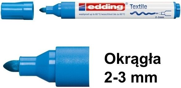 Jasnoniebieskimarker tekstylny do ubrań - Edding 4500 ma okrągłą końcówkę, która pozwala na rysowanie linii o grubości od 2 do 3 mm. Pozwala z łatwością tworzyć piękne wzory na różnych tkaninach, takich jak bawełna i len. Tusz szybko schnie i można go prać w temperaturze do 60ºC.