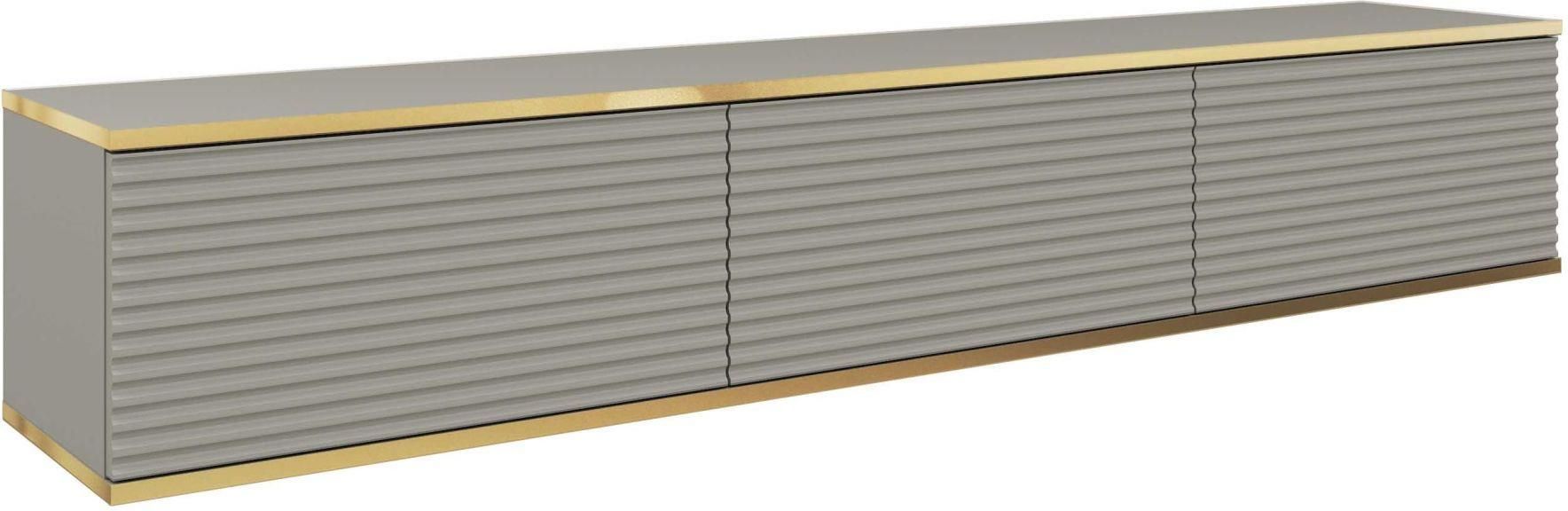Szafka RTV ORO to eleganckie rozwiązanie dla Twojego salonu lub pokoju dziennego. Została wykonana z wysokiej jakości płyty laminowanej w kolorze białym, co sprawia, że ​​jest ona łatwa do utrzymania w czystości i pasuje do wielu różnych stylów dekoracyjnych. Obrzeża z ABS w kolorze złotym dodają jej stylowego wykończenia, a jednocześnie chronią ją przed uszkodzeniami i zarysowaniami. Szafka RTV posiada pojemne wnętrze, które pomieści wiele różnych urządzeń elektronicznych, takich jak, konsolę do gier, odtwarzacz DVD czy Blu-ray oraz wiele innych. Dzięki temu, że szafka jest wisząca, oszczędzisz cenną przestrzeń podłogową, a jednocześnie stworzysz nowoczesny wygląd Twojego salonu. Wszystkie materiały wykorzystane do produkcji tej szafki RTV są trwałe i odporne na uszkodzenia, co zapewnia długą żywotność i wytrzymałość. Jest to doskonały wybór dla osób, które szukają praktycznego i stylowego rozwiązania do przechowywania swoich urządzeń elektronicznych. Cechy charakterystyczne produktu szafka RTV dedykowana do salonu nowoczesny design system otwierania push to open pojemne wnętrze dwie pojemne komory blat górny oraz dolny wykończony obrzeżem w kolorze złota fronty MDF Ryflowane Szczegóły produktu Szerokość całkowita: 175 cm Wysokość całkowita: 30 cm Głębokość całkowita: 32 cm Kolor frontu: szary Kolor korpusu: złoty Front: mdf ryflowany Wykończenie: mat Liczba drzwi: 3 Typ: wisząca Kolekcja: ORO
