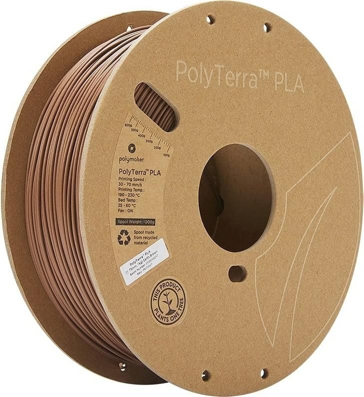 Filament Polymaker PolyTerra PLA 1,75mm 1kg - Earth Brown Filament PolyTerra PLA to całkowicie biodegradowalny i przyjazny dla środowiska materiał. Łączy ze sobą materiały organiczne wraz z PLA, jednocześnie zmniejszając ilość zawartego w nim plastiku. Produkt został nawinięty na tekturową szpulę . …