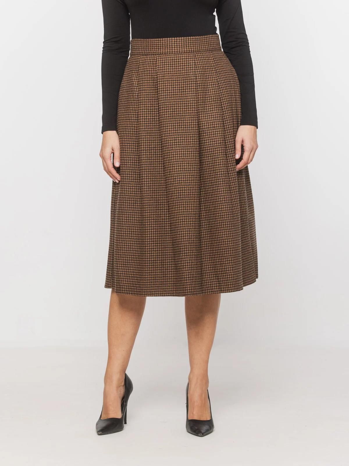 Spódnica fałdowana Fałdowana spódnica z wysokim stanem i charakterystycznymi, ozdobnymi zakładkami, sprawia, że kobieca sylwetka nabiera kształtu klepsydry, ukrywając przy tym niechciane niedoskonałości figury. Spódnica dodatkowo posiada dwie kieszenie, pasek materiałowy i ściągacz w pasie. Dzięki lekkiemu materiałowi i braku wszytej podszewki spódnica świetnie sprawdzi się nie tylko w casualowej stylizacji urlopowej, ale również eleganckiej – biurowej. Kolor główny: brązowa i czarna pepitka Rodzaj spódnicy: fałdowana (2 fałdy z przodu i z tyłu), długość MIDI Dodatki: dwie boczne kieszenie, zamek błyskawiczny z tyłu, czarna podszewka Skład tkaniny wierzchniej: 60% wełna, 20% poliamid, 20% wiskoza Skład podszewki: 94% poliester, 6% elastan Gwarancja: 24 m-ce Uszyta w Polsce
