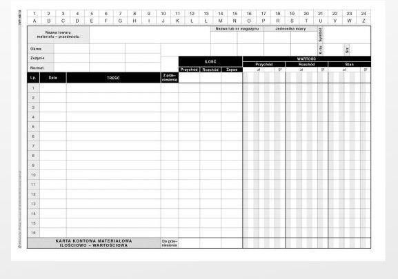 437-3 Karta kontowa materiałowa ilościowo-wartościowa format: A5 rodzaj papieru: karton offsetowy zastosowanie: druki kasowe, księgowe i bankowe oprawa: komplet 20 kartek druk: dwustronny