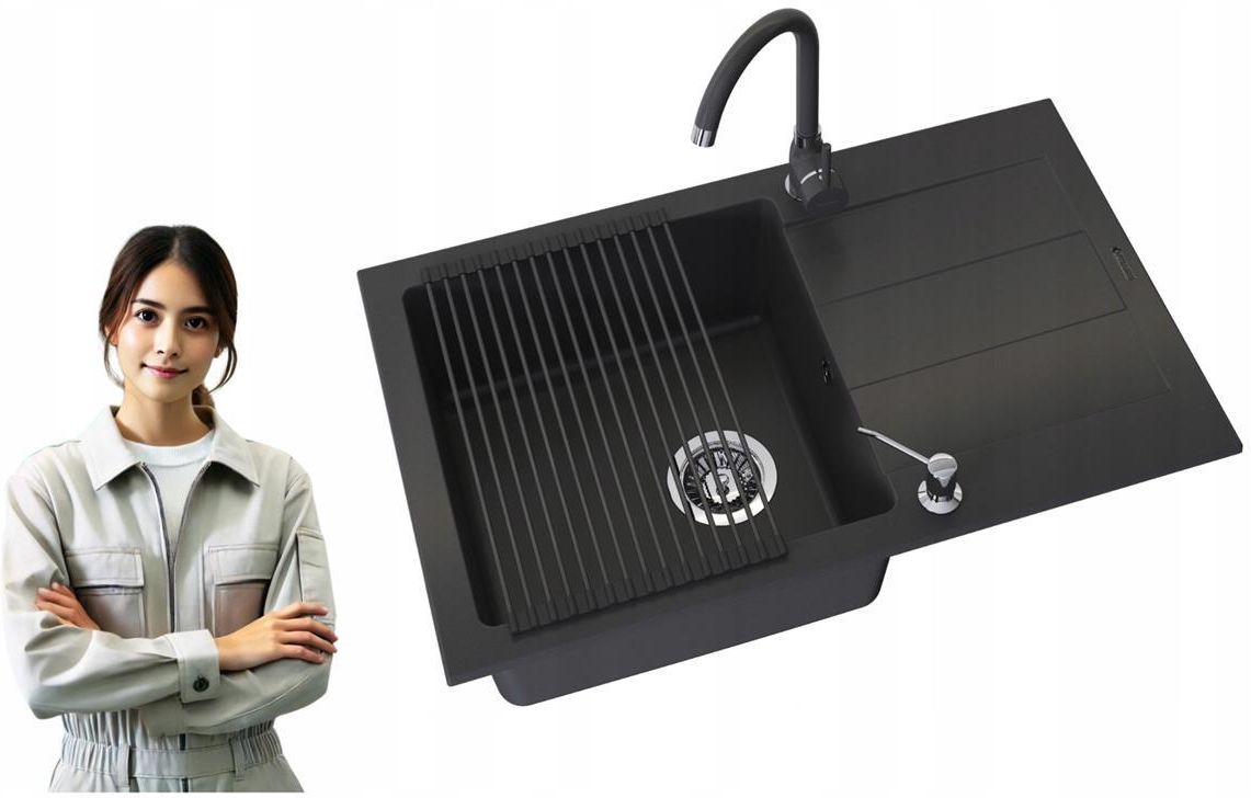 ZESTAW PYRAMIS JEDNOKOMOROWY ZLEWOZMYWAK GRANITOWY karbon BATERIA KUCHENNA BELLO karbon DOZOWNIK NA PŁYN chrom ROLMATA DO ZLEWU czarna SYFON MANUALNY chrom ZALETY Wysoka odporność na zarysowania, temperaturę i plamy – wykonany z granitowego kompozytu, zlew zachowuje estetyczny wygląd nawet przy intensywnym użytkowaniu. Nowoczesny i uniwersalny design – minimalistyczna forma doskonale komponuje się z wnętrzami w stylu nowoczesnym, klasycznym czy skandynawskim. Łatwość w utrzymaniu czystości – gładka powierzchnia ułatwia pielęgnację, oszczędzając czas i wysiłek. Trwałość na lata – solidne wykonanie i odporne materiały gwarantują długą żywotność bez utraty walorów estetycznych. Kompaktowa, jednokomorowa konstrukcja – idealna do mniejszych kuchni, oferując jednocześnie pełną funkcjonalność. SPECYFIKACJE I DANE TECHNICZNE Wymiary zewnętrzne: 780 x 480 mm Wymiary komory: 400 x 400 mm Głębokość komory: 200 mm Średnica odpływu: 92 mm Ilość komór: 1 Ociekacz: Tak Otwory montażowe: 2 przygotowane otwory (oraz dwa podwierty technologiczne) Sposób montażu: Nablatowy Wykończenie: Karbon Powierzchnia: Gładka i łatwa do utrzymania w czystości Odwracalny: tak BATERIA KUCHENNA BELLO – karbon Bateria Pyramis Bello Plus to propozycja dla osób ceniących nowoczesny design oraz wygodę użytkowania. Stworzona z dbałością o detale, idealnie sprawdzi się w każdej kuchni, oferując nie tylko estetykę, ale i niezawodność. Łatwość montażu i użytkowania Stylowy wygląd, który nada elegancji każdej kuchni SPECYFIKACJE I DANE TECHNICZNE Wysokość całkowita: 362 mm Zasięg wylewki: 200 mm Wysokość wylewki: 275 mm Typ wylewki: Obracana o 360 Typ: Jednouchwytowa Głowica: Ceramiczna Podłączenie wody: 3/8 cala DOZOWNIK NA PŁYN – chrom Elegancki dozownik do płynu do mycia naczyń lub mydła, zaprojektowany z myślą o funkcjonalności i estetyce. Dzięki prostemu, nowoczesnemu designowi doskonale wkomponuje się w każdą kuchnię. Wykonany z trwałych materiałów, zapewnia długotrwałe użytkowanie i łatwość utrzymania w czystości. Wysoka jakość wykonania Uniwersalność zastosowania SPECYFIKACJE I DANE TECHNICZNE Wykonanie Górna część: Stal nierdzewna z wykończeniem w błyszczącym chromie. Zbiornik na płyn: Wykonany z wysokiej jakości tworzywa sztucznego. Wysokość całkowita: 240 mm. Wysokość zbiornika: 145 mm. Zasięg wylewki: 105 mm. Średnica otworu montażowego: 25 mm. Pojemność zbiornika: 500 ml. Kolor: Chrom Mechanizm pompki: Manualny, łatwy w użyciu. Uzupełnianie płynu: Odbywa się od góry poprzez odkręcenie pompki, co eliminuje konieczność demontażu całego dozownika ROLMATA DO ZLEWU – czarna Praktyczna i wielofunkcyjna mata ociekowa, która łączy nowoczesny design z funkcjonalnością. Dzięki zwijanej konstrukcji jest niezwykle kompaktowa i łatwa w przechowywaniu. Idealna do suszenia naczyń, owoców i warzyw. Oszczędność miejsca Nowoczesny wygląd
