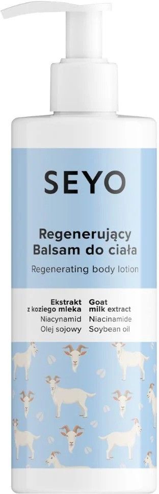 Seyo balsam do ciałaRegenerujący balsam do ciała przeznaczony dla skóry suchej i normalnej. Zawarte w produkcie: ekstrakt z koziego mleka, olej sojowy, niacynamid znane są z właściwości odbudowujących oraz odżywiających.Po użyciu balsam zapewni uczucie zregenerowanej oraz intensywnie nawilżonej skóry. Produkt szybko się wchłania, nie pozostawiając uczucia lepkości.Sposób użycia:Nałóż odpowiednią ilość balsamu na skórę, delikatnie wmasuj. Przeznaczony do codziennej pielęgnacji ciała.