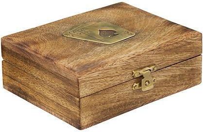 Przygotuj się na interesującą rozgrywkę! Zanurz się w klasyczny świat gier karcianych z talią kart "Odile" od Atmosphera, która łączy w sobie ponadczasowy styl i dekoracyjny urok. Karty są elegancko przechowywane w solidnym pudełku wykonanym z drewna mango, które dodaje całości wyjątkowego, vintage'owego charakteru. Wieko pudełka, zamykane na zatrzask, ozdobiono mosiężnymi elementami w kształcie kart, co nadaje mu jeszcze bardziej wyrafinowany wygląd. Dzięki starannemu wykonaniu i wysokiej jakości materiałom, talia kart "Odile" jest nie tylko funkcjonalnym dodatkiem do Twojej kolekcji gier, ale również stylowym elementem dekoracyjnym. Drewniane pudełko z pewnością przyciągnie wzrok gości i doda elegancji każdemu wnętrzu, w którym się znajdzie. Idealne do wieczornych spotkań z przyjaciółmi lub jako prezent dla miłośników klasycznych gier. Zestaw zawiera 54 karty, które idealnie sprawdzą się zarówno w klasycznych grach karcianych, jak i w tworzeniu własnych, unikalnych zasad gry. Talia "Odile" to doskonały sposób na wprowadzenie odrobiny luksusu do codziennych chwil relaksu. Co musisz wiedzieć przed zakupem? Pudełko z drewna mango ozdobione mosiężnymi elementami dodaje całości klasy i stylu Idealne połączenie użytkowego akcesorium z elementem dekoracyjnym Wysokiej jakości drewno i mosiądz zapewniają trwałość i wytrzymałość