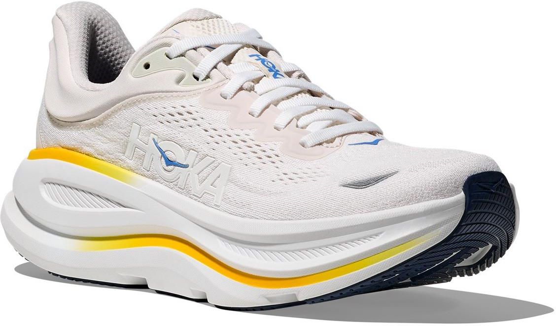Damskie buty do biegania o maksymalnej amortyzacji Hoka W Bondi 9 to jedne z najmocniejszych butów w ofercie HOKA, zapewniające doskonałą przyczepność podczas codziennych kilometrów. Damskie buty do biegania W Bondi 9 firmy Hoka są wygodne i są odpowiednie do maratonów i długodystansowych biegów wytrzymałościowych dzięki wyjątkowo dużej amortyzacji. To najwygodniejszy i najbardziej stylowy model butów szosowych od Hoka. Dzięki wysokiemu poziomowi amortyzacji buty są odpowiednie dla cięższych biegaczy lub biegaczy z wrażliwością kolan na uderzenia. Wysoka podeszwa z dodatkową amortyzacją i oddychająca cholewka sprawiają, że jest to zrównoważony but na naprawdę długie biegi. Bondi 9 ma teraz lepszą amortyzację pod stopami dzięki wysokiej jakości piance EVA, która zapewnia miękki i elastyczny bieżnik. Wyprofilowany kołnierz 3D i strukturalna dzianinowa cholewka ze strefową oddychalnością są wykończone gumą Durabrasion, która spowalnia zużycie. Model Bondi 9 szanuje środowisko, dlatego do jego produkcji użyto materiałów zrównoważonych. Dokładniej mówiąc, siatka z recyklingu i podszewka zostały wykonane z materiałów pochodzących z recyklingu. Główne cechy: cholewka buta z minimalnymi szwami i wysoką oddychalnością część pięty buta jest wyposażona w Lycrę dla wygodnego bieżnika wkładka w kształcie kołyski dla wygodnego dopasowania lekka pianka EVA zapewnia doskonałą amortyzację i niską wagę drop 5 mm maksymalne tłumienie HOKA wykonanie z trwałych materiałów