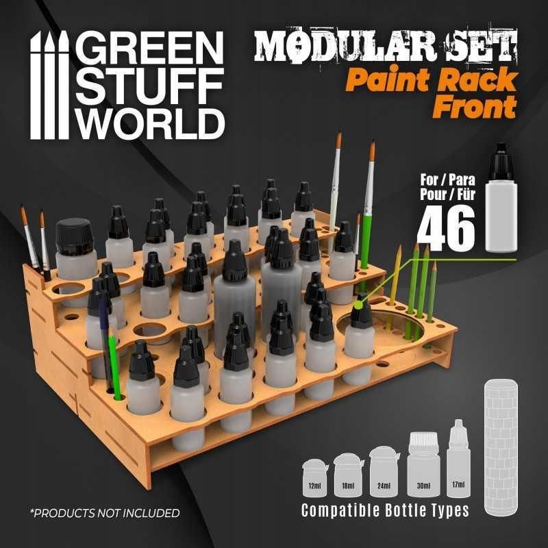 Modułowy stojak na farbę - PRZÓD Ekspozytor na pojemniki z farbkami wykonany z wysokiej jakości DREWNA MDF. Montaż tego wyświetlacza jest szybki i prosty. Jeśli chcesz go wzmocnić, zalecamy użycie standardowego kleju PVA (kleju do drewna). W zestawie znajdują się łączniki umożliwiające łączenie ich z innymi modułami po lewej i prawej stronie. Jest także kompatybilny z modułami szufladowymi GSW. Wewnętrzne otwory pozwolą na ustawienie pojemników z farbą zarówno w pozycji stojącej, jak i do góry nogami. Wymiary: długość 30 cm x szerokość 20 cm x wysokość 10 cmWydajność na kombinację: - 46x garnki 17ml- 34x garnki 17ml + 12x 30/10/18ml- 34x garnki 17ml + 5x 30/10/18ml + 7x wałki do ciasta * Ten przedmiot nie obejmuje pędzli ani garnków z farbą. Ten element musi zostać zmontowany, ale zawiera instrukcję montażu.