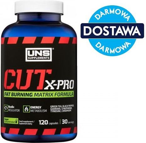 CUT X-PRO Przyspiesza redukcje tkanki tłuszczowejPodnosi wewnętrzną temperaturę ciałaZwiększa produkcję energii w organizmieWpływa pozytywnie na układ odpornościowy UNS CUT X-PRO jest specjalnym suplementem diety, którego recepturę opracowano z myślą o sportowcach nastawionych na efektywną redukcję tkanki tłuszczowej i równoczesny rozwój beztłuszczowej masy mięśniowej. Zastosowanie suplementu firmy UNS zapewni optymalną dawkę chromu, co przyczynia się do zmniejszenia łaknienia, jednak najważniejszym czynnikiem w skutecznym spalaniu tkanki tłuszczowej jest podwyższenie wewnętrznej temperatury ciała, co powoduje zwiększone zapotrzebowanie organizmu na energię, którą czerpie ze spalania tłuszczu. UNS CUT X-PRO dzięki unikalnej formule uruchamia procesy termogenezy, dzięki czemu wspomaga redukcję tkanki tłuszczowej. Dodatkowym składnikiem jest kofeina, która doda energii na cały dzień !Dawkowanie: 1 porcja (4 kaps.) rano oraz przed treningiem lub po południu (w dni nietreningowe) Skład: UNS CUT X-PRO Porcja: 4 kaps. Ilość porcji w opakowaniu: 30 Opakowanie: 120 kaps. Zawartość: w porcji: zaw: L- tyrozyna 1000mg Ekstrakt z zielonej herbaty 500mg Ekstrakt z gorzkiej pomarańczy 334mg z czego synefryna 20mg Ekstrakt z guarany 182mg w tym kofeina 40mg Kofeina 160mg Ekstrakt z pieprzu czarnego 5mg Chrom 200μg Składniki: L- tyrozyna, Ekstrakt z liści zielonej herbaty (Camelia sinensis), Ekstrakt z owoców gorzkiej pomarańczy (Citrus aurantum), Ekstrakt z nasion guarany (Paullinia cupana), kofeina, substancja przeciwzbrylająca (sole magnezowe kwasów tłuszczowych), Ekstrakt z owoców pieprzu czarnego (Pipper nigrum), pikolinian chromu, otoczka (żelatyna, barwnik: dwutlenek tytanu).
