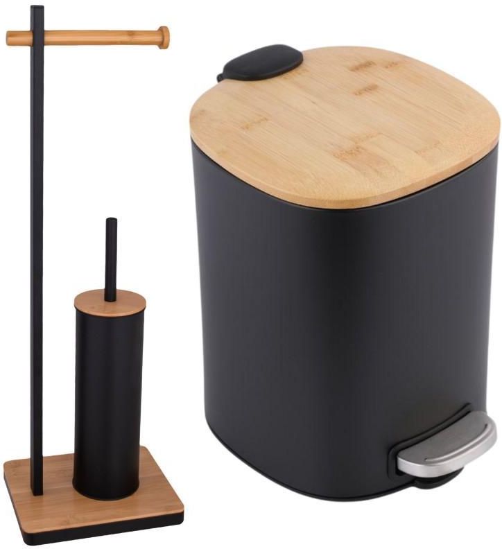 Zestaw łazienkowy: Kosz na śmieci 5L Stojak 2w1 Szczotka do WC z uchwytem na papier toaletowy CZARNY/BAMBUS - Yoka home Nasielsk