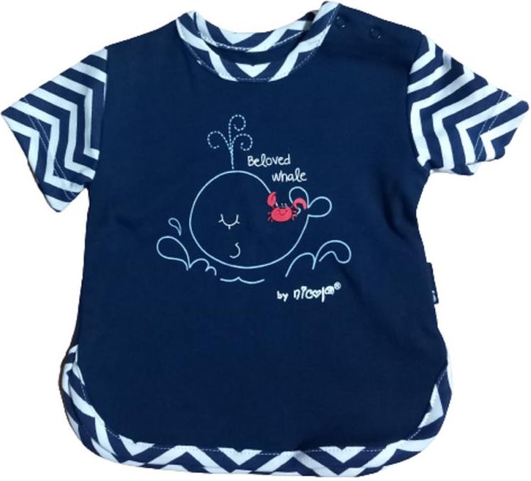 Bawełniana bluzeczka chłopięca z krótkim rękawem. Dominujący kolor granatowy połączono ze wstawkami w biało-granatowe wzory. Na ramionku zapinana na napki. W centralnej części ubranka uroczy nadruk wieloryba i kraba. Ubranko najwyższej jakości, bezpieczne dla delikatnej skóry dziecka. 100% bawełna Rozmiar: 62 cm Obwód klatki piersiowej: 47 cm