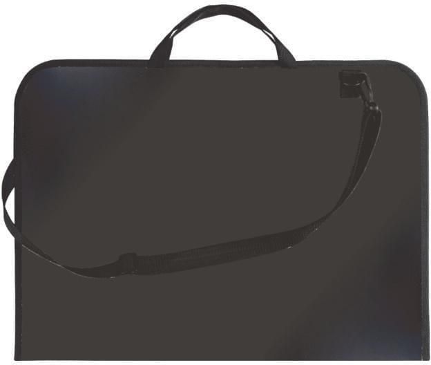 Teczka wykonana ze sztywnego tworzywa PP w kolorze czarnym. Wymiary teczki 38x52 cm umożliwiają przechowywanie prac plastycznych w formacie A3 z zapasem miejsca. Wyposażona w zamknięcie na suwak oraz materiałowe rączki i odpinany pasek na ramię.