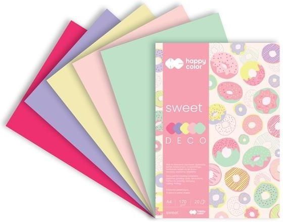 Blok papierów dekoracyjnych Happy Color Deco Sweet. Świetnie sprawdzi się przy tworzeniu zaproszeń, dyplomów, kartek świątecznych oraz scrapbookingu. Kolory: 5 kolorów pastelowych Format: A4 Gramatura: 170g/m2 Ilość arkuszy: 20 (5 x 4) Papier wysokiej jakości, barwiony w masie Nadaje się do drukarek atramentowych i laserowych Wysoka odporność na blaknięcie przez promienie UV Papier jest bezkwasowy, bezdrzewny